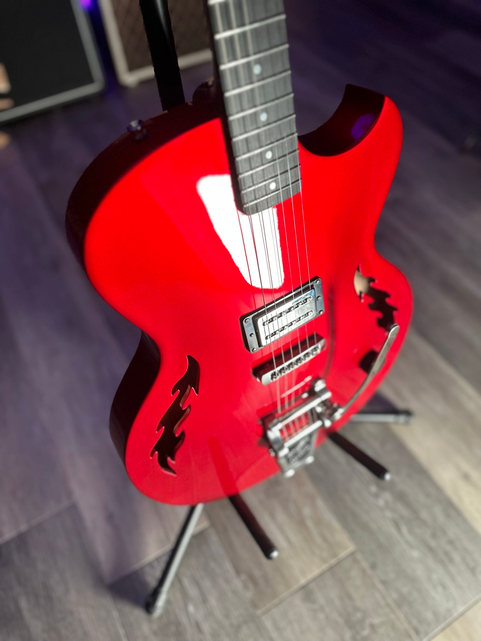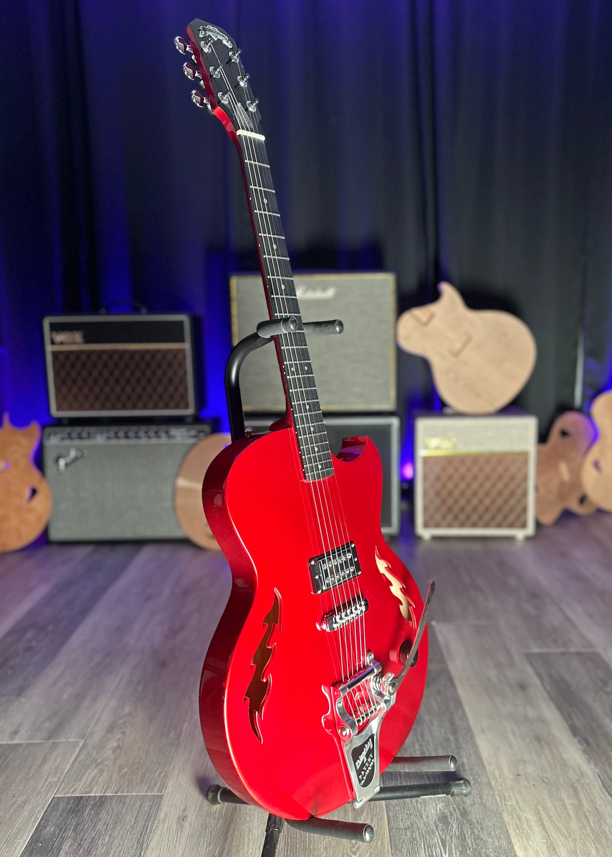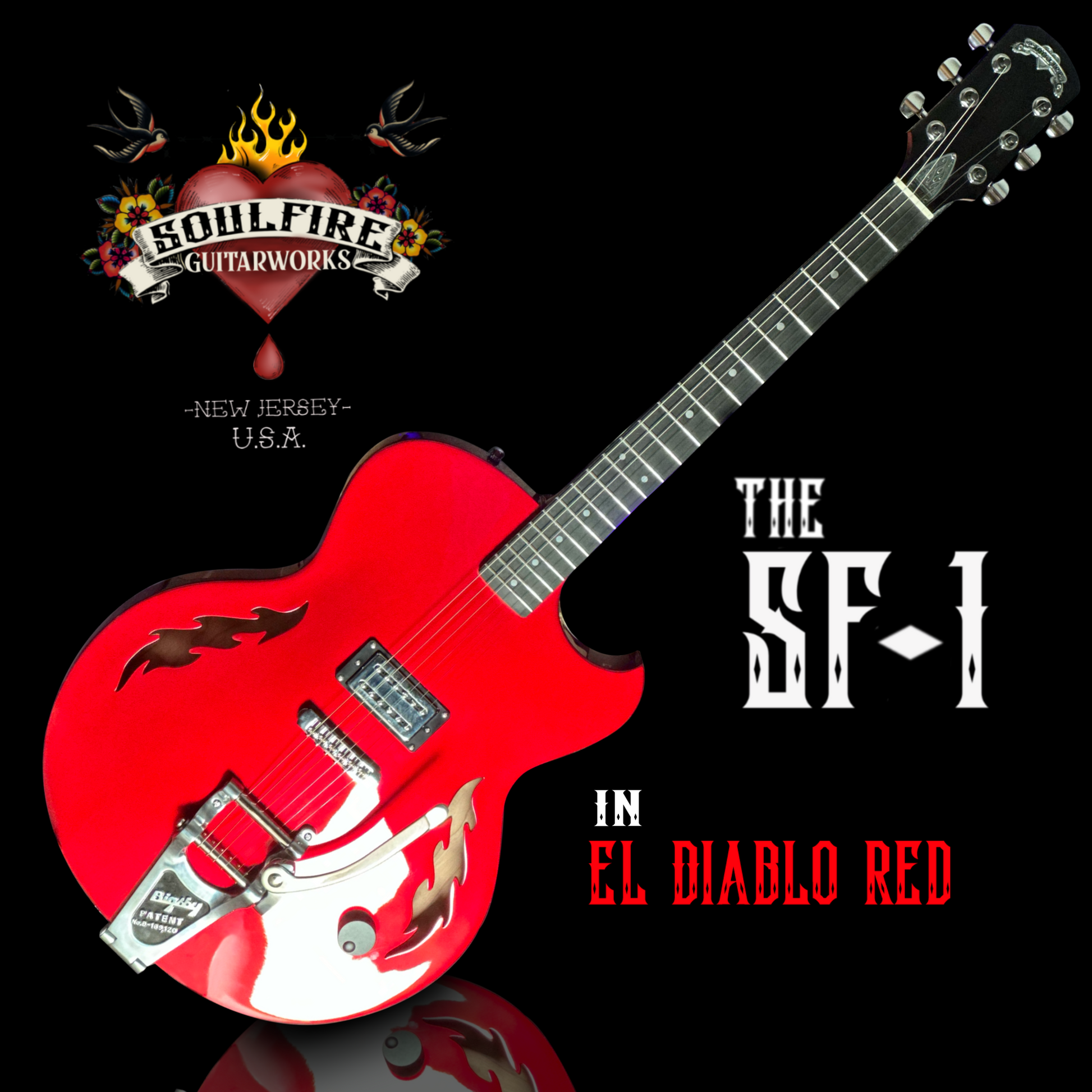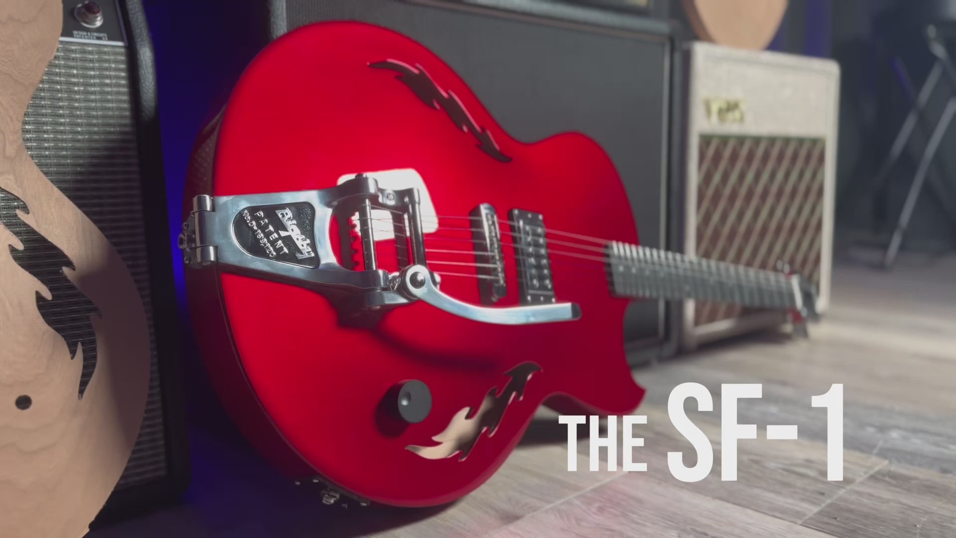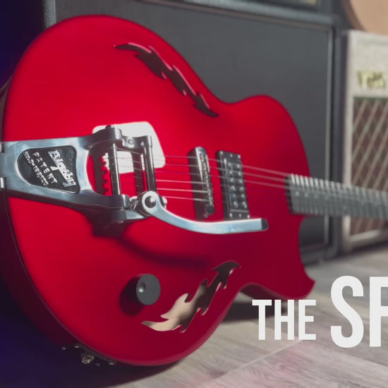 Our stunning , first ever, SF-1 is available. Serial number SF1-23001. Dripping in El Diablo red this semi-hollow beast boasts our single house-made and hand-wound “wicked-mojo”TM humbucker, aluminum fret markers, signature flame F-holes, silver-plated and antiqued emblem and truss rod cover, bigsby and all the tone you could ever wish for. Constructed from carved sustainable cherry tone woods and richlite fingerboard. Premium soft roadrunner case included .