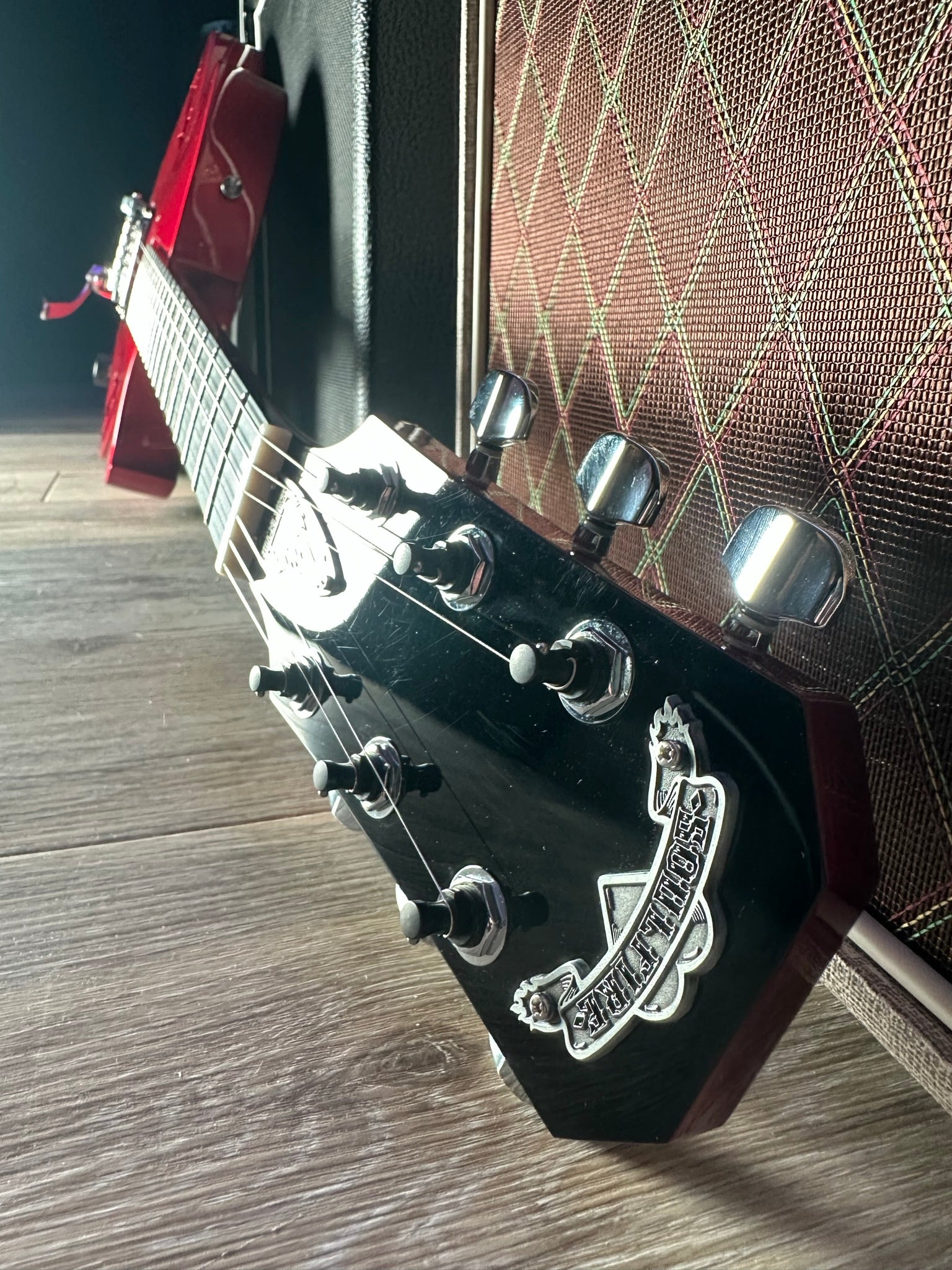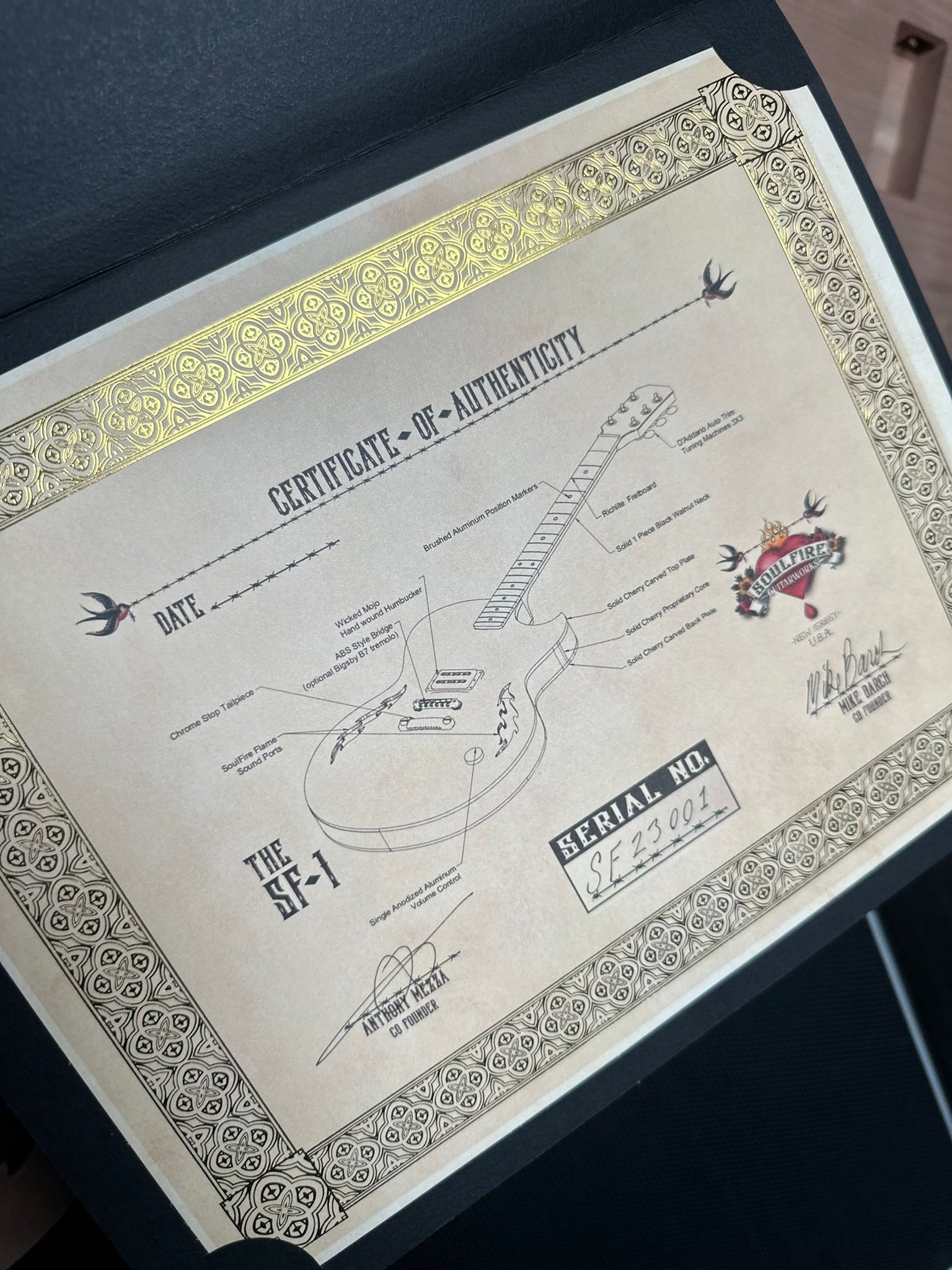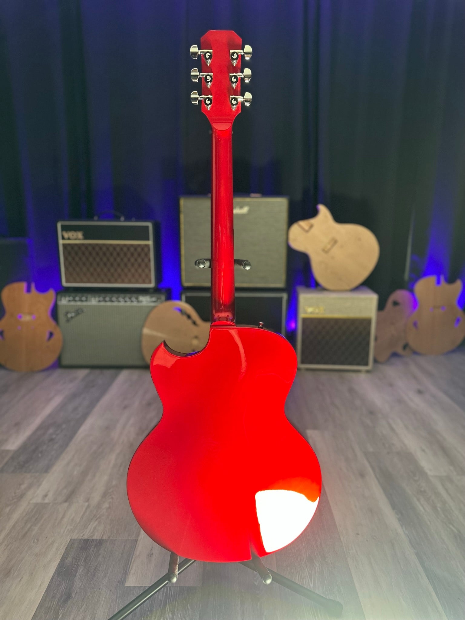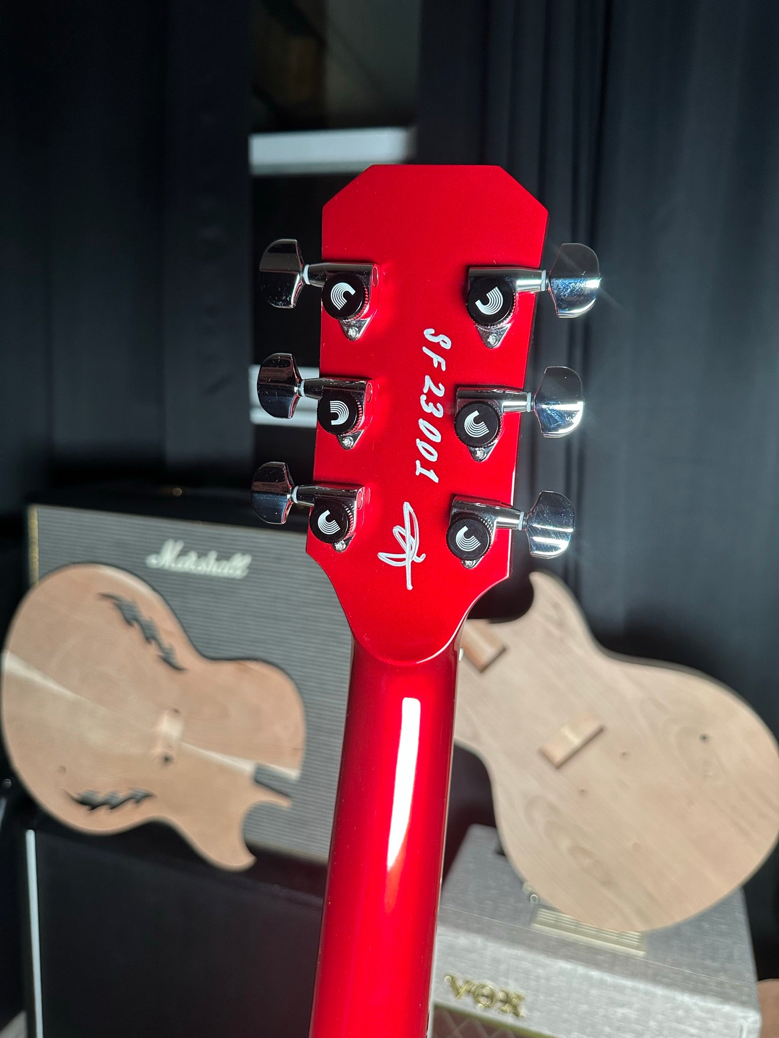 Our stunning , first ever, SF-1 is available. Serial number SF1-23001. Dripping in El Diablo red this semi-hollow beast boasts our single house-made and hand-wound “wicked-mojo”TM humbucker, aluminum fret markers, signature flame F-holes, silver-plated and antiqued emblem and truss rod cover, bigsby and all the tone you could ever wish for. Constructed from carved sustainable cherry tone woods and richlite fingerboard. Premium soft roadrunner case included .